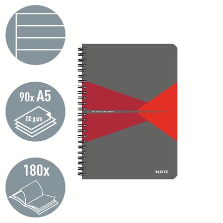 Spirálfüzet, A5, vonalas, 90 lap, PP borító, LEITZ "Office", szürke-piros