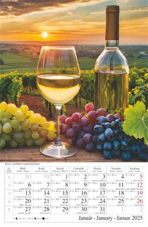 -naptár rész: magyar, angol, német nyelven, magyar ünnepek és névnapokkal, napkelte, napnyugta és holdállás feltüntetésével